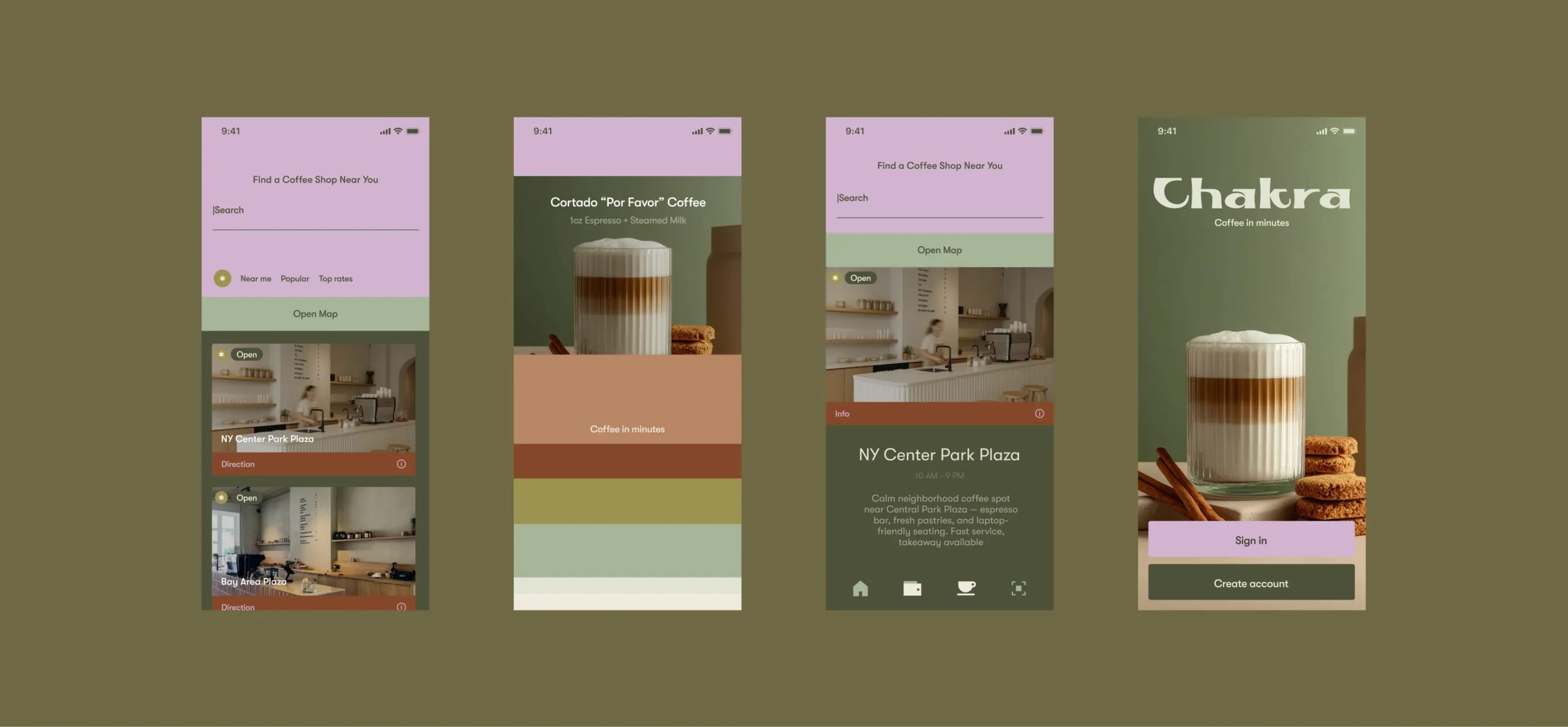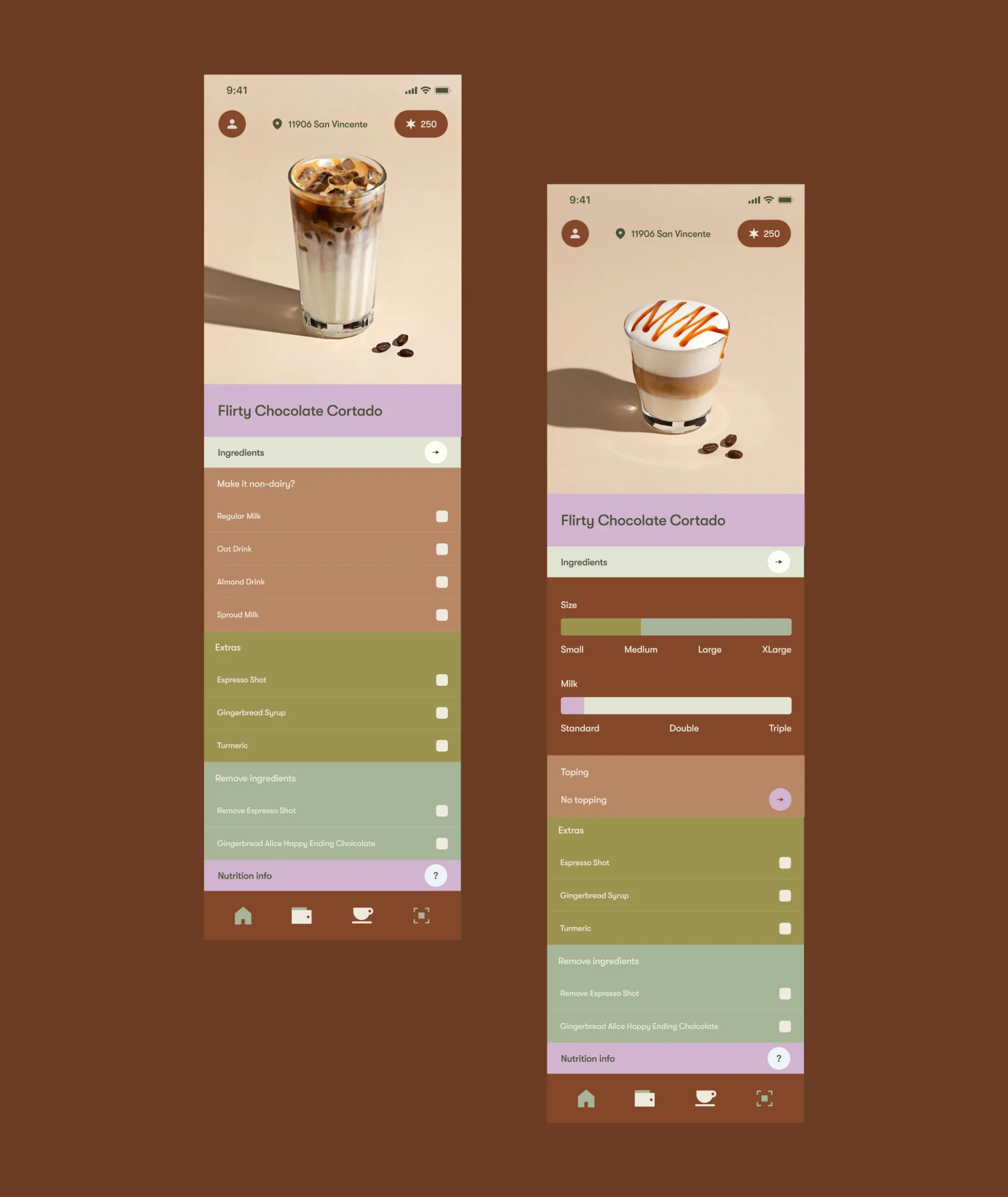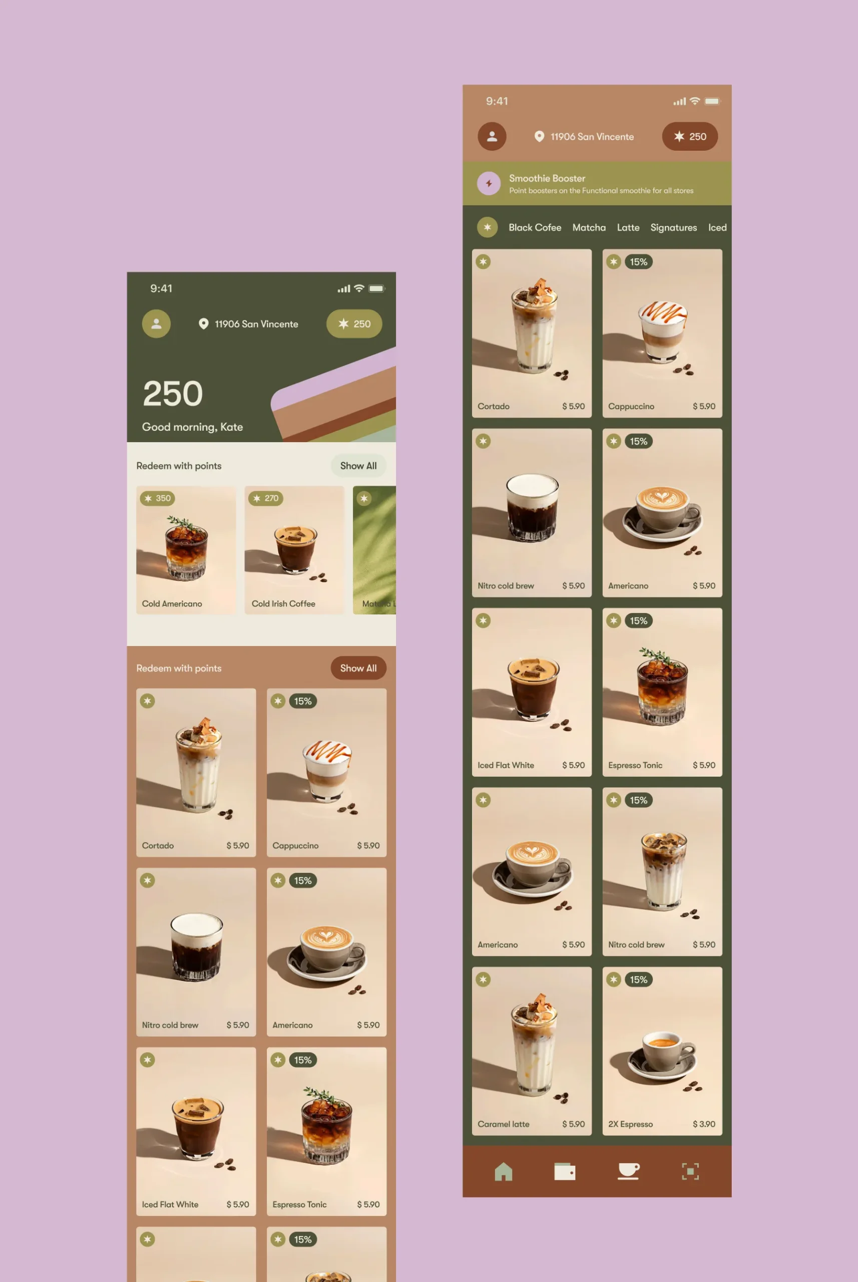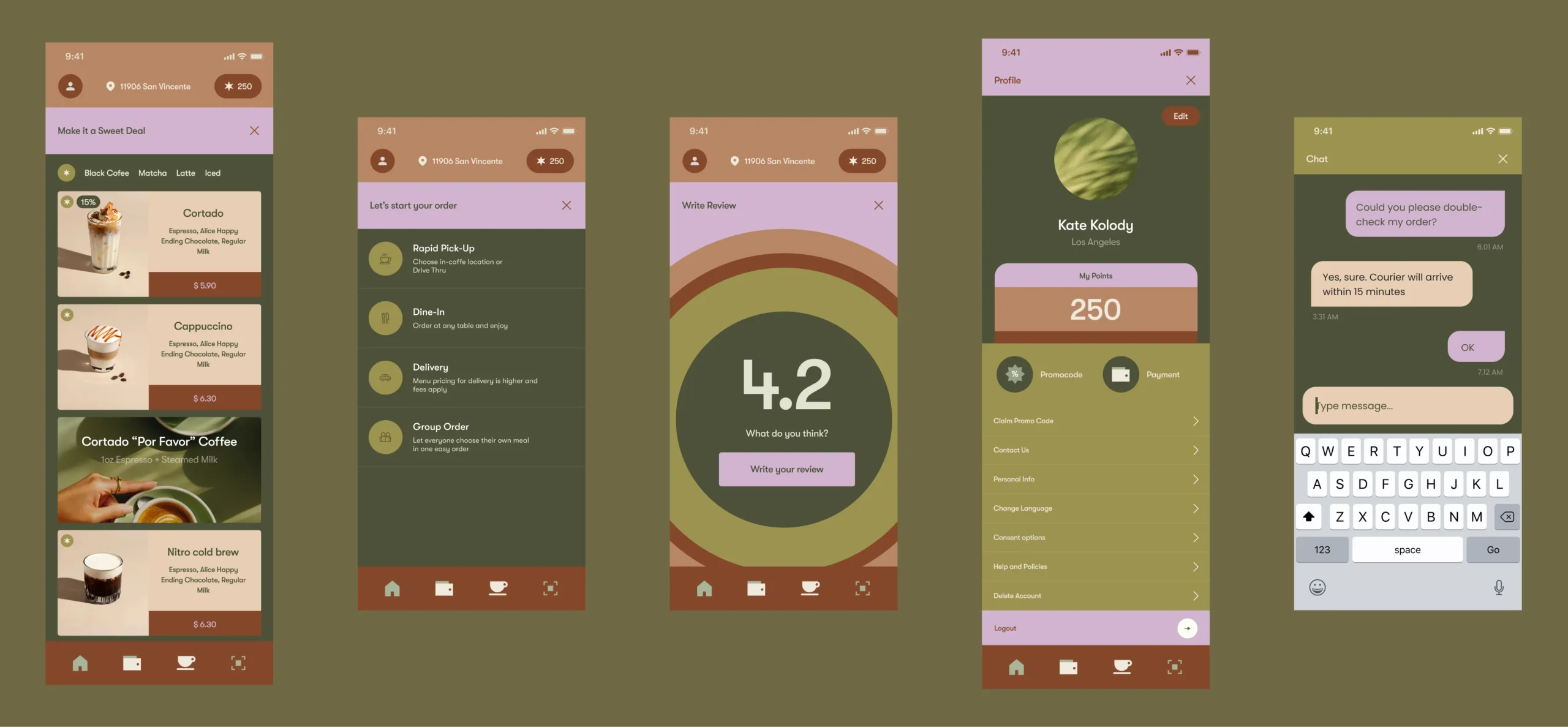 I owned the full product design and brand foundation from zero: brand concept, logo direction, visual system, UX research of comparable premium coffee apps, information architecture, menu and category logic, product card behavior, customization rules, pickup vs delivery vs group order flows, cart mechanics, checkout structure, and the loyalty program UX (points, redemption, and rewards surfaces).