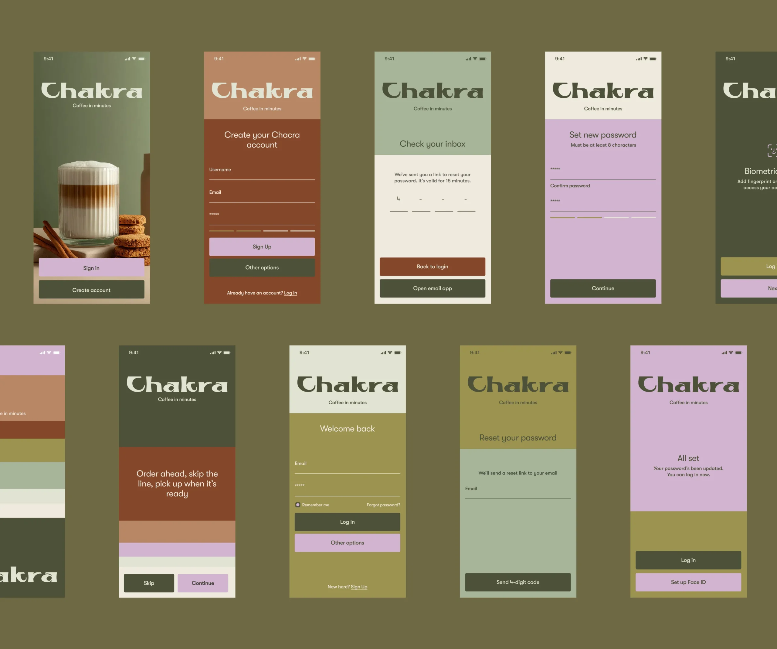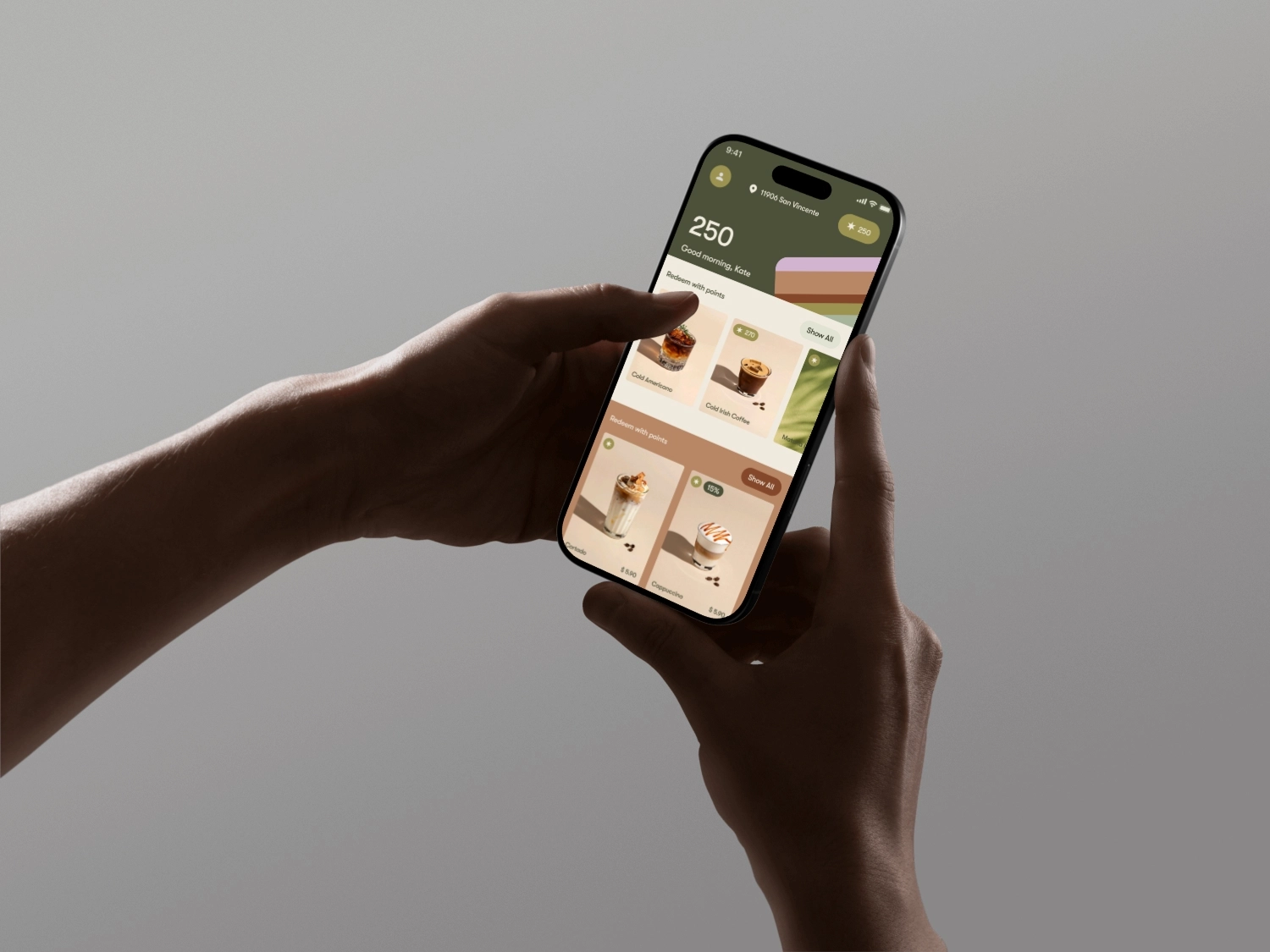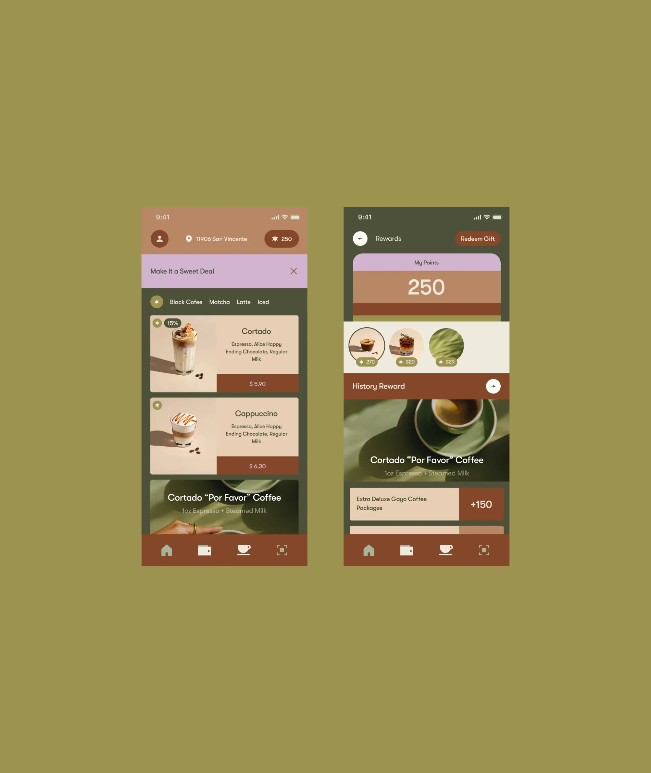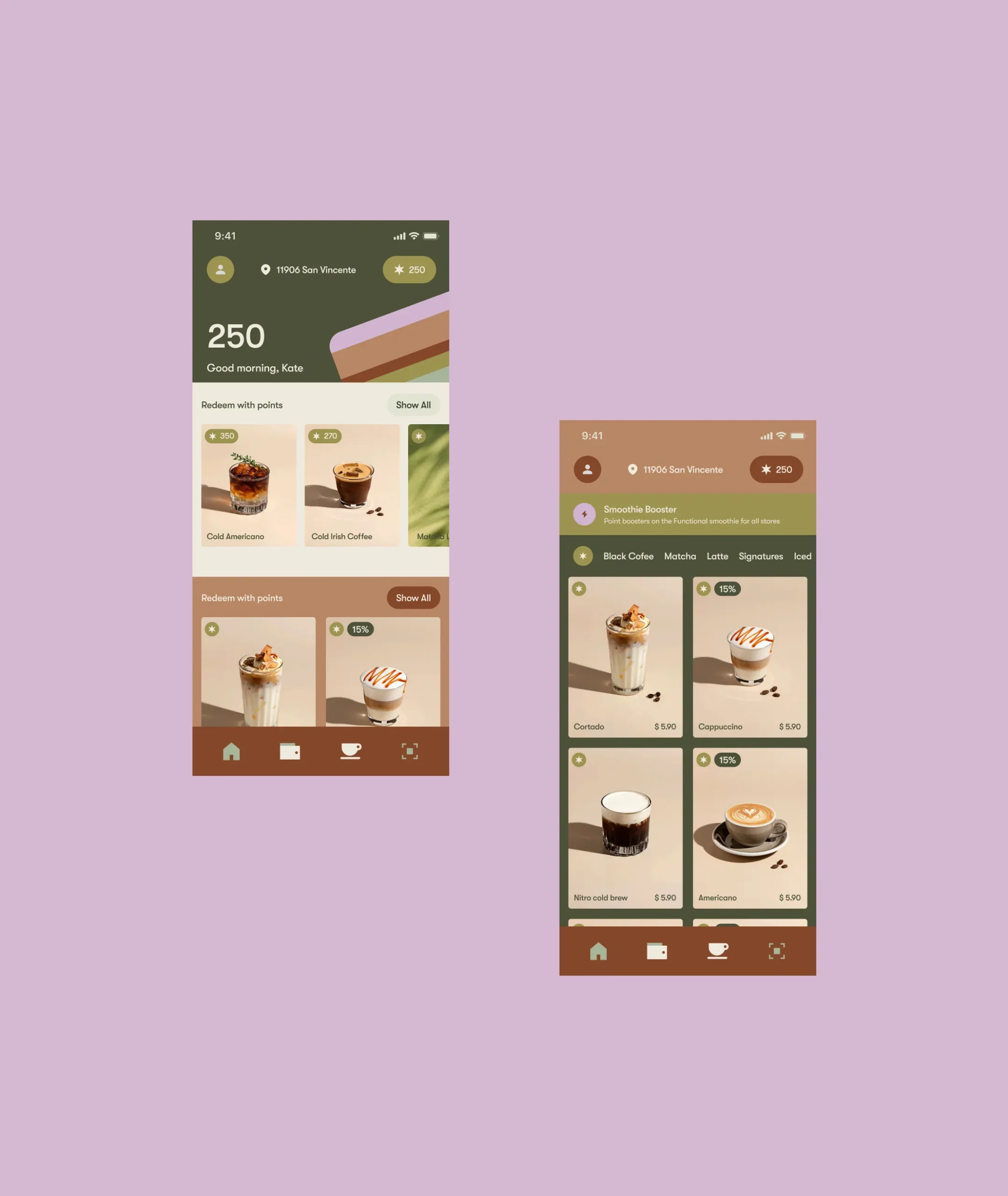 I owned the full product design and brand foundation from zero: brand concept, logo direction, visual system, UX research of comparable premium coffee apps, information architecture, menu and category logic, product card behavior, customization rules, pickup vs delivery vs group order flows, cart mechanics, checkout structure, and the loyalty program UX (points, redemption, and rewards surfaces).
